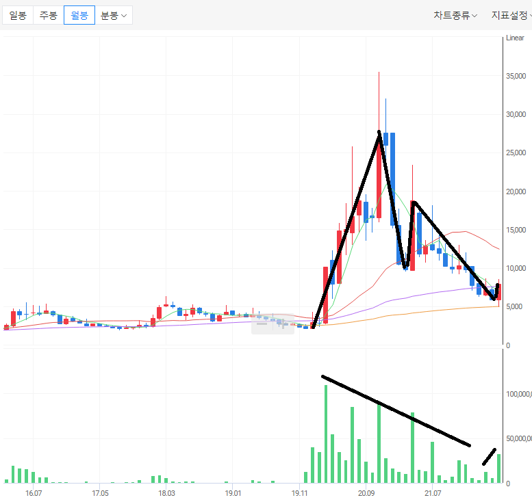 ㄴ) 월봉 차트에서 상승 후 하락이 마무리되어 한 사이클이 완성된 것처럼 보인다. 5월에 거래량이 상승되고 있어서 연속적인 상승의 흐름이 기대된다.