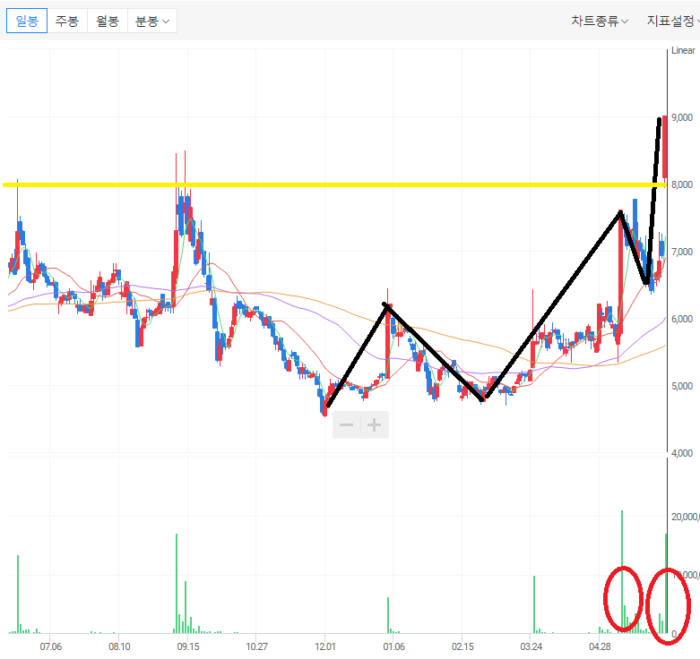 ㄱ) 일봉 차트에서 눌림목을 만들고 전고점 부근을 강하게 돌파하며, 매물대를 넘어서, 강하게 상승하고 있다.