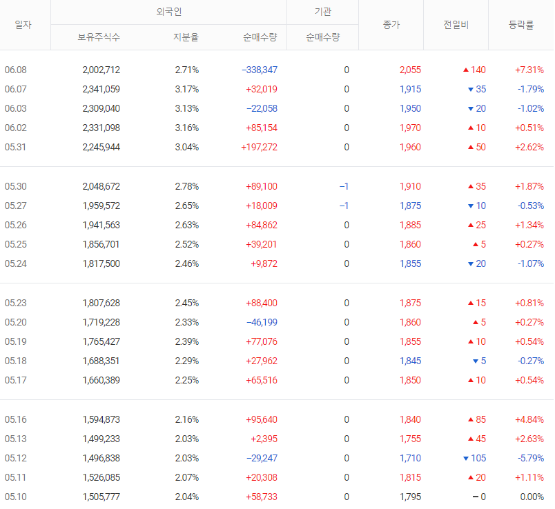 ㄷ) 지난 4월부터 외국인이 매수하였는데 테슬라 카메라 모듈 납품 소식에는 매도하고 있는 반면에, 개인과 기관은 매수하고 있다.