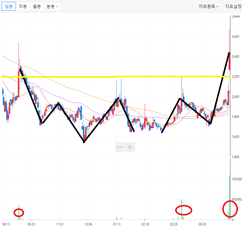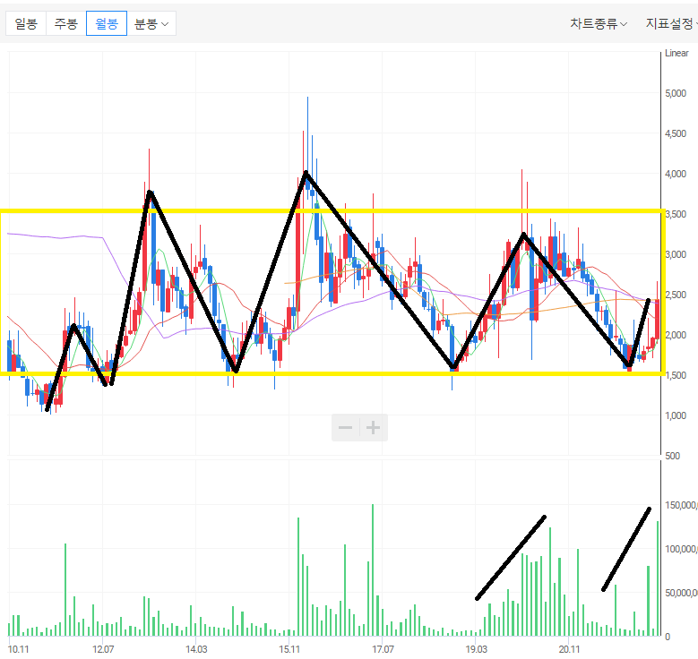 ㄴ) 월봉 차트에서 주가는 장시간 동안 박스권을 그리면서 상승과 하락을 반복하고 있다. 최근에는 연속적으로 거래량이 증가하는 추세는 좋은 모습이고 주요 이동평균선들을 뚫고 상승하는 모습이 인상적이다.