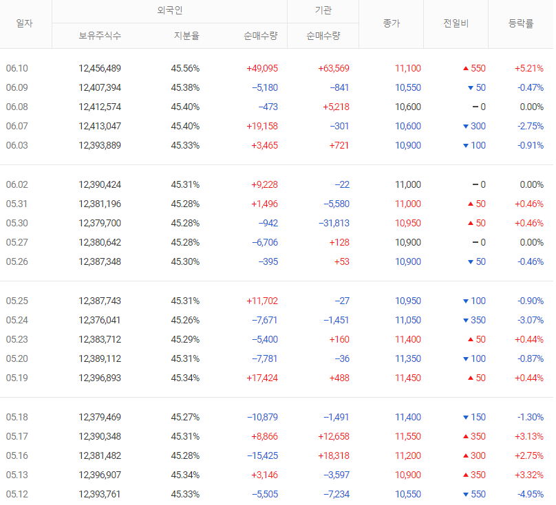 ㄴ) 6월 10일 수급은 개인 13.0억 매도, 외국인 5.3억 매수, 기관 7.0억 매수하였다. 기관 중에서 투신이 6.2억 매수하였다.