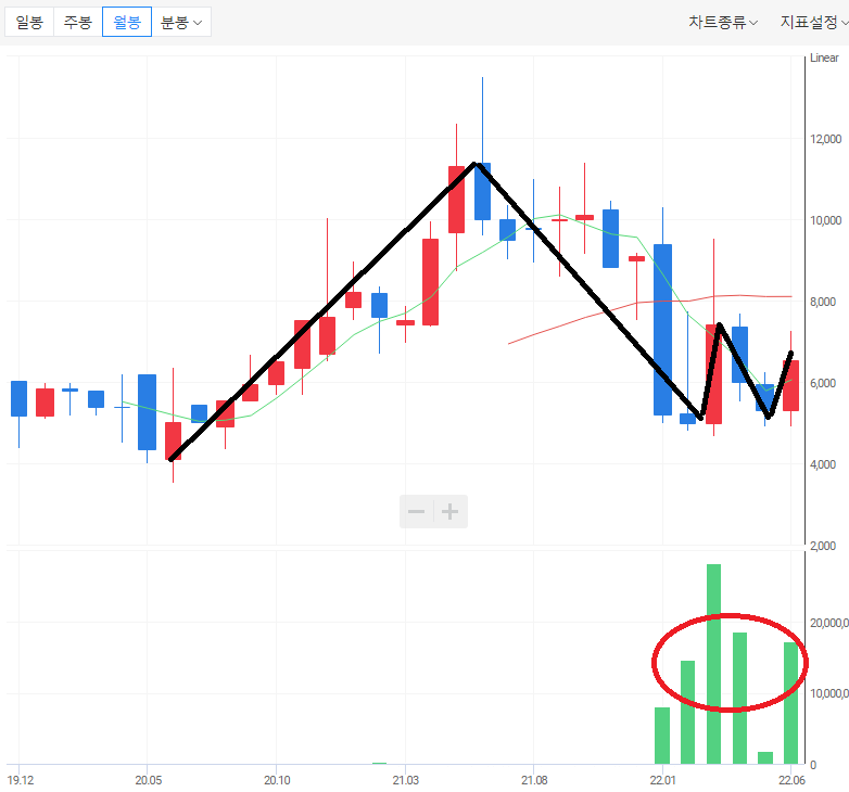 ㄴ) 월봉 차트에서 상장 이후에 한차례 시세가 나온 뒤에 조정을 받고 다시 상방 또는 하방으로 움직이려고 하고 있다.