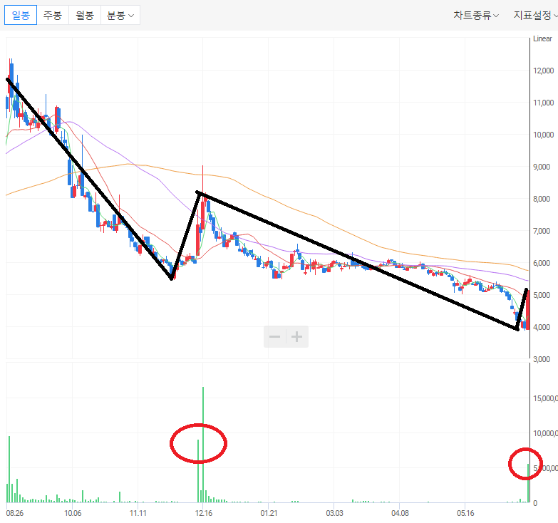 ㄱ) 일봉 차트에서 지난해 7월 고점을 만들고 약 1년 동안 하락하다가 상한가를 만들었다.