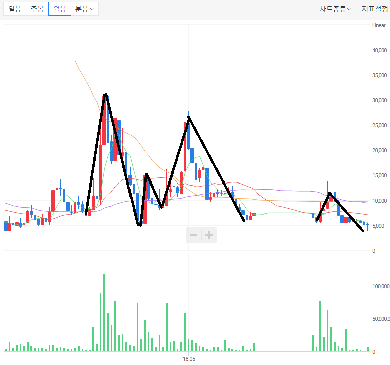 ㄴ) 월봉 차트에서 2016년과 2018년 크게 상승한 후 약 1년 동안 거래 정지되었고 상승 후 하락하다가 반등이 들어오고 있다.