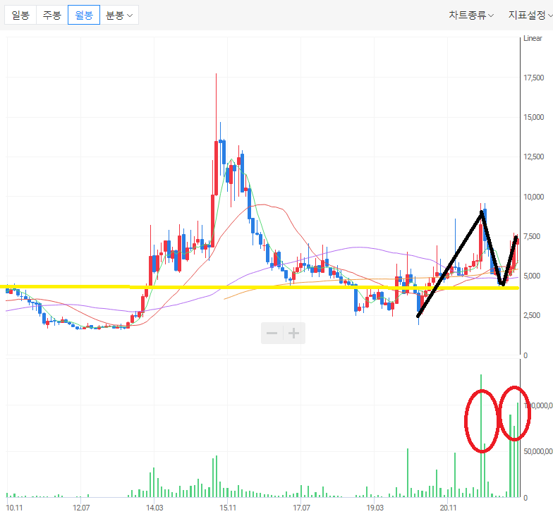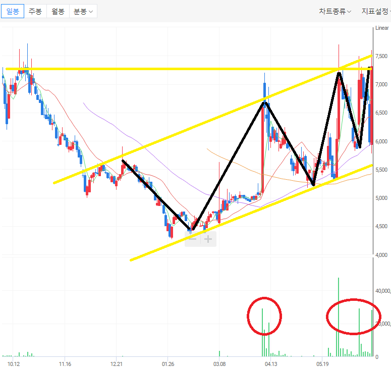 지금의 주가는 전고점 부근에 위치해 있어서 전고점을 돌파하는 상승 또는 매물대에 맞고 하락하는 갈림길 위치에 있다.