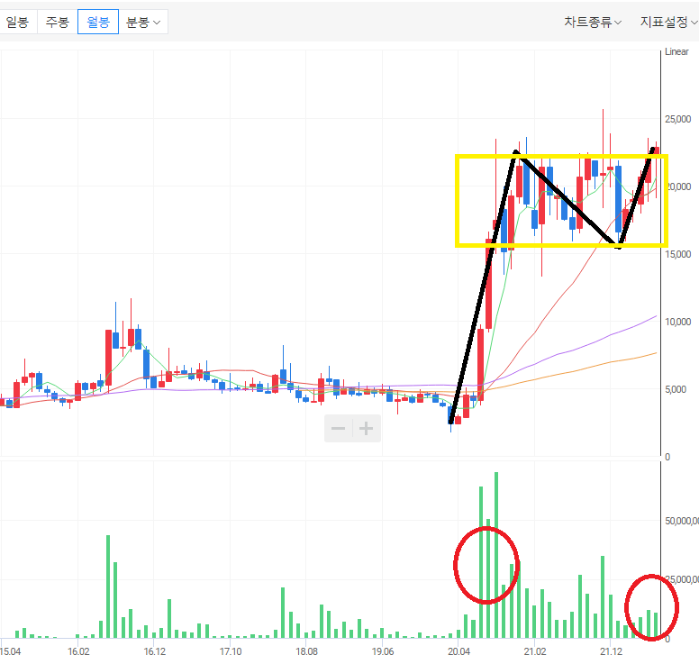 ㄴ) 월봉 차트에서 지난 2020년에 대세 상승 후 주가는 위, 아래로 움직이면서 박스권을 만들었다. 만약에 박스권을 돌파한다면 52주 신고가의 형태로 진행될 가능성이 높다.