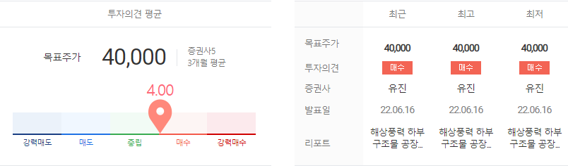 ⓐ 6월 16일 유진투자증권은 목표주가 4만 원, 투자의견 매수를 제시하였으며, 기존 사업권을 보유한 삼호조선해양을 흡수 합병하였으며, 해상풍력 하부 구조물 전용 공장의 신설 준비가 법적으로 완료되어 차별화된 실적과 전방산업에 주목한다고 전망하였다.