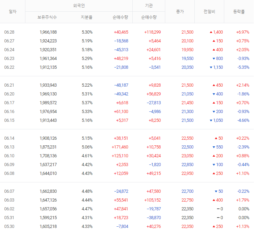 ㄴ) 6월 29일 수급은 개인 39.1억 매도, 외국인 43.9억 매수, 기관 2.2억 매도하였다.