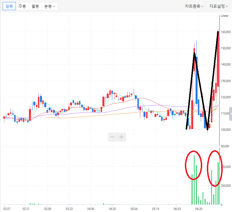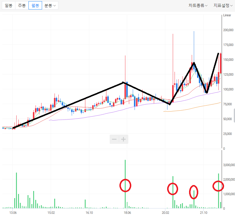 ㄴ) 월봉 차트에서 대량의 거래량이 발생하면 크게 상승하였다가 길게 윗꼬리를 달고 내려오는 것을 조심해야 한다. 지금은 양봉으로 상승 중이다.