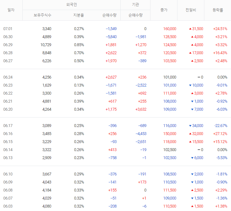 ㄴ) 7월 1일 수급은 4.2억 매수, 외국인 3.8억 매도, 기관 0.2억 매도하였다.