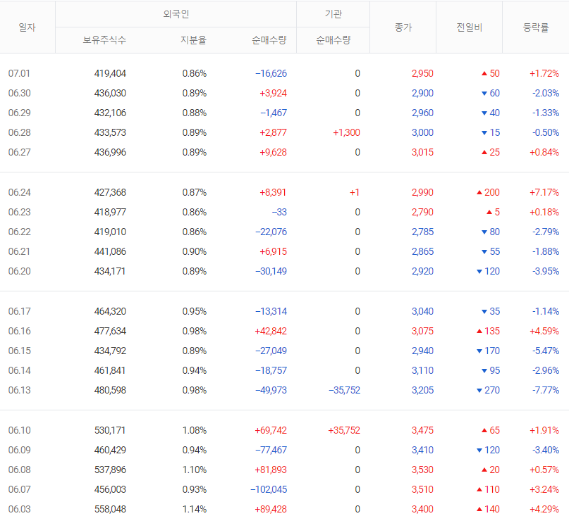 ㄴ) 7월 4일 수급은 개인 3.2억 매수, 외국인 1.1억 매도, 기관 0.05억 매도하였다. 기타 법인 1.8억 매도하였다.