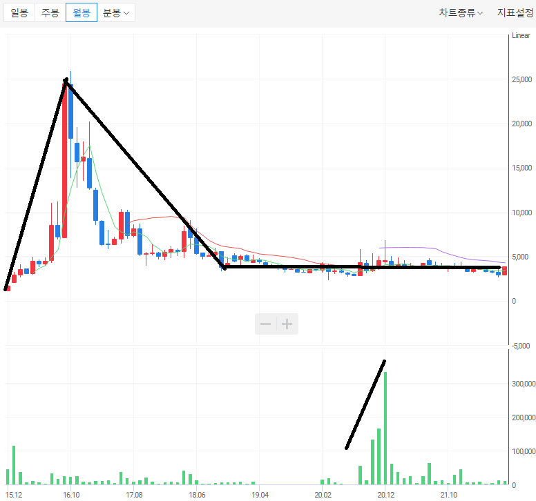 ㄴ) 월봉 차트에서 상장 후에 큰 시세가 나왔지만, 주가는 다시 원위치에 도달하였고 약 5년 동안 횡보하였다. 우크라이나 재건에 참여한다는 모멘텀으로 지금은 상승하고 있다.