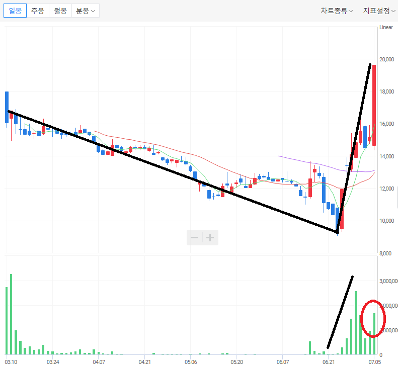 ㄱ) 일봉 차트에서 7월 5일 전일보다 거래량이 상승하면서 전고점을 넘어갔다.