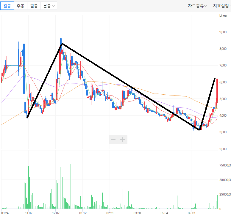 ㄴ) 월봉 차트에서 거래가 증가하면서 상승하는 것은 좋은 모습이다. 파동은 상승에 더 무게를 두고 있다.