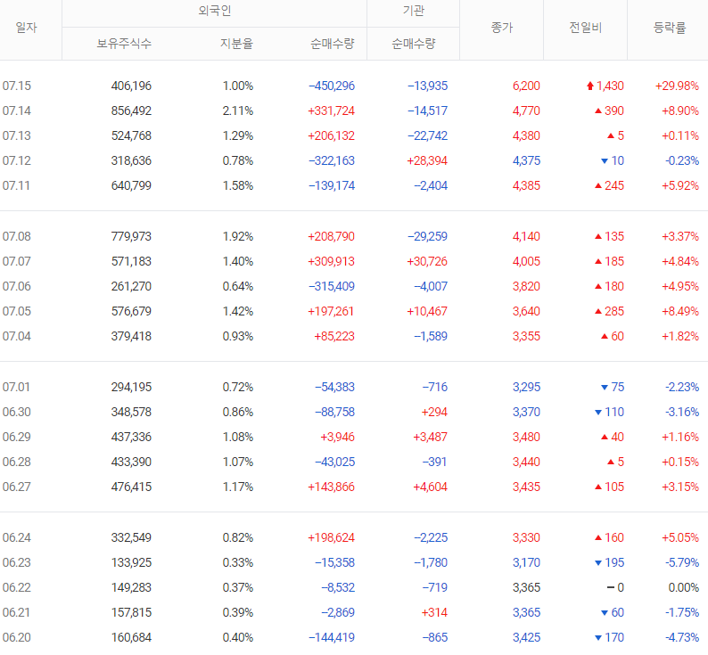 ㄴ) 7월 15일 수급은 개인 16.3억 매수, 외국인 2.4억 매도, 기관 0.7억 매도하였다. 또한 기타 법인이 9.3억 매수하였다.
