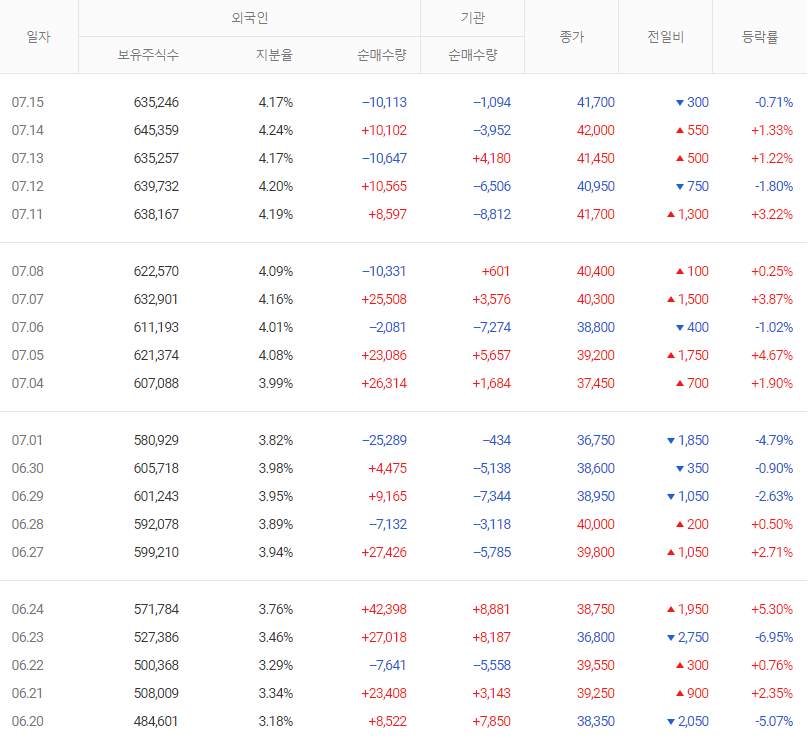 ㄴ) 7월 18일 수급은 개인 21.4억 매도, 외국인 31.1억 매도, 기관 2.7억 매도하였다. 개인, 외국인, 기관이 모두 매도하였는데 상한가를 기록한 것은 기타 법인이 58.9억 매수하였기 때문으로 풀이된다.