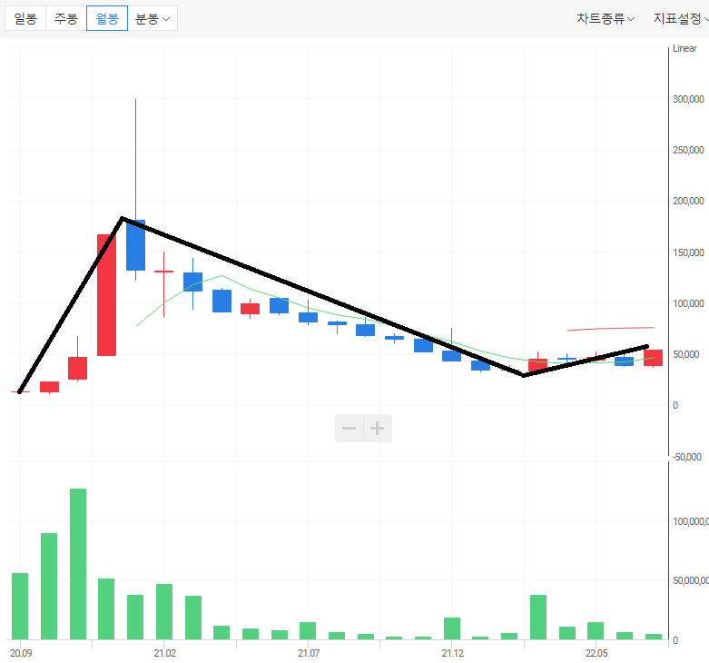ㄴ) 월봉 차트에서 상장하고 대시세를 만들 후에 조정을 받다가 7월에는 양봉을 만들고 있다.