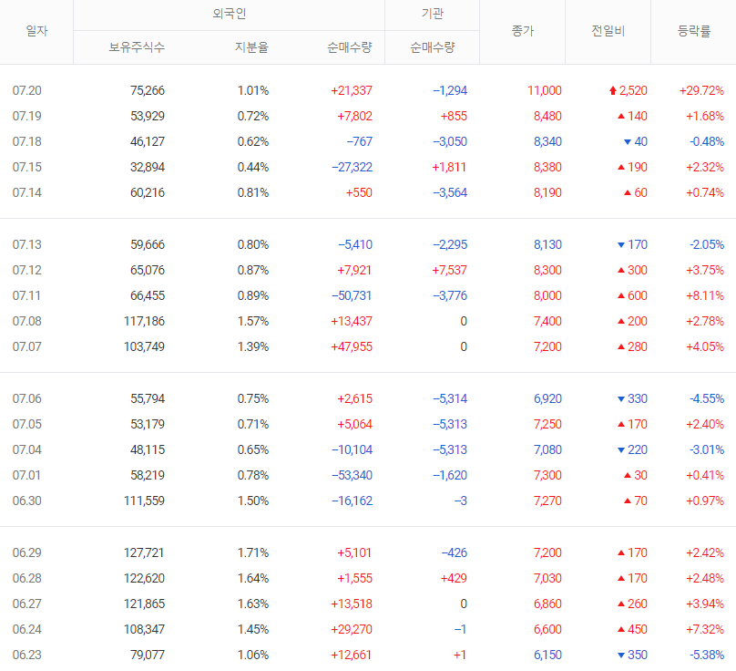ㄴ) 7월 20일 수급은 개인 1.6억 매도, 외국인 2.1억 매수, 기관 0.1억 매도하였다.