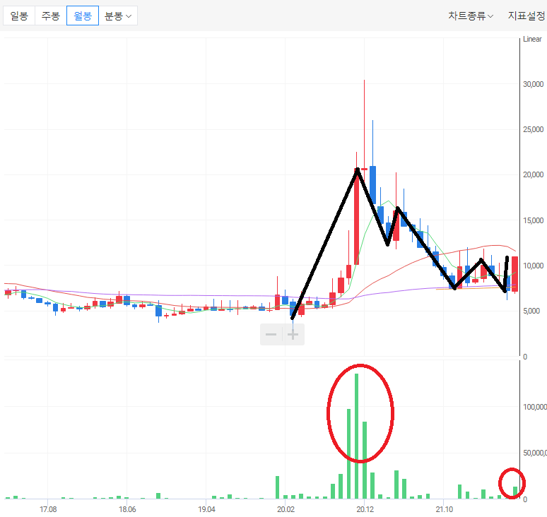 ㄴ) 월봉 차트에서 2020년 백신 유통에 콜드체인이 필요하다는 모멘텀으로 대세 상승하였으나 주가는 다시 원위치로 복귀하였다. 지금의 주가는 다시 상승 중이다.