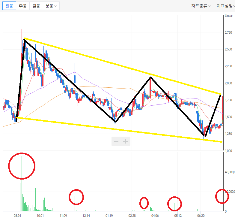 ㄱ) 일봉 차트에서 고점이 낮아지고 저점도 낮아지는 패턴으로 주가는 움직이고 있다. 전고점을 뛰어넘기가 쉽지는 않아 보이나 지금의 기세는 강하다.