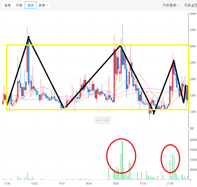 ㄴ) 월봉 차트는 박스권의 행보를 보이고 있다. 차트에서 확인할 수 있듯이, 상승하기 위해서는 거래량이 반드시 필요하다.