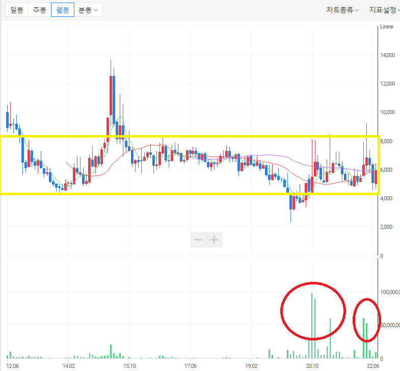 ㄴ) 월봉 차트에서 오랜 시간 동안 박스권 횡보를 하고 있다. 그리고 2000년부터 거래량이 증가하는 모습을 볼 수 있다.