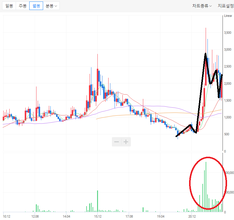 ㄴ) 월봉 차트에서 전고점을 넘어서려고 하는 시도가 이루어질 것 같은 분위기이다. 조일알미늄의 차트를 보면 상승 후에 윗꼬리가 긴 양봉이 자주 나왔다.