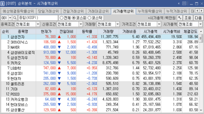 시가 총액 상위 주식들의 흐름은 보합이다.