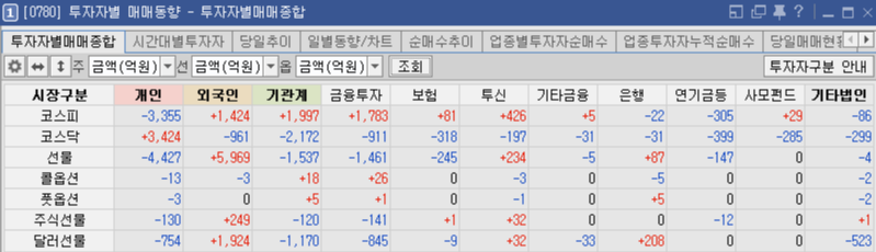 오늘은 코스피에 외국인과 기관의 수급이 들어왔다.