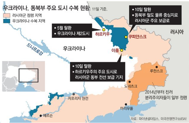 우크라이나와 러시아의 전쟁이 200일이 지나면서 러시아가 점령한 지역을 우크라이나가 영토 3,000k㎡ 이상을 탈환하면서 전세가 역전되는 양상을 보이고 있다.
