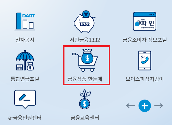 ㄴ) 금융감독원 첫 화면 우측에 금융상품 한눈에를 클릭한다.