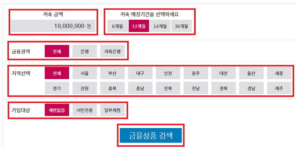 ㄹ) 본인에게 맞는 조건을 입력 후에 금융상품 검색을 클릭한다.