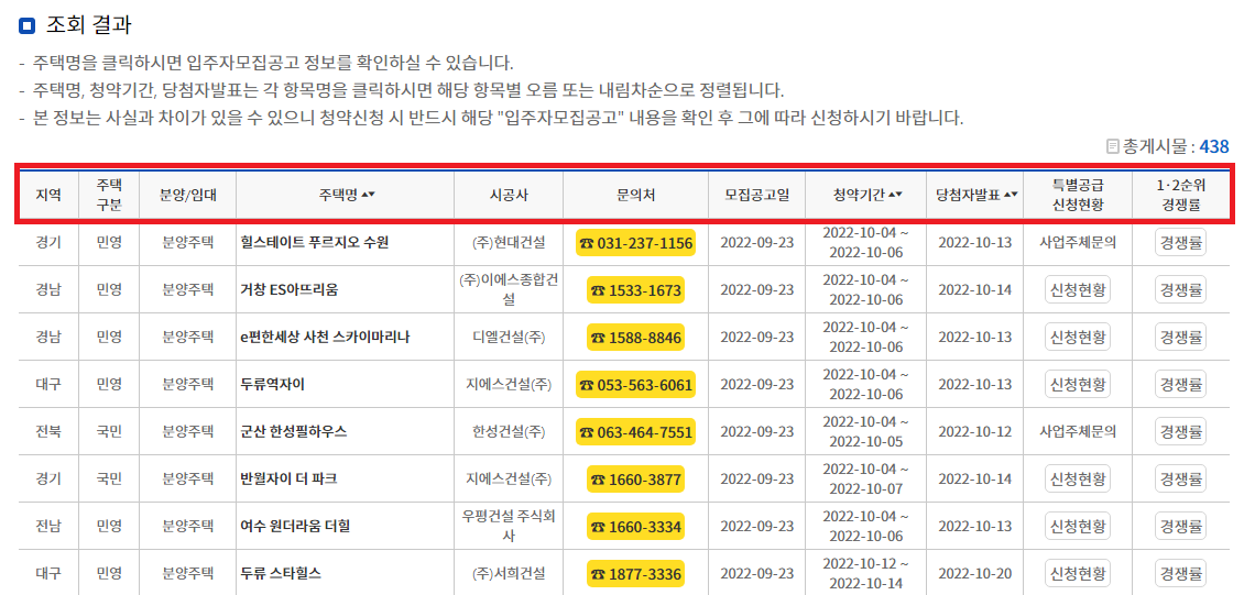 청약 분양정보/경쟁률을 조회하면 지역, 주택 구분, 분양/임대, 주택명, 시공사, 문의처, 모집공고일, 청약기간, 당첨자 발표, 특별공급 신청현황, 1,2순위 경쟁률 등을 알 수 있다.