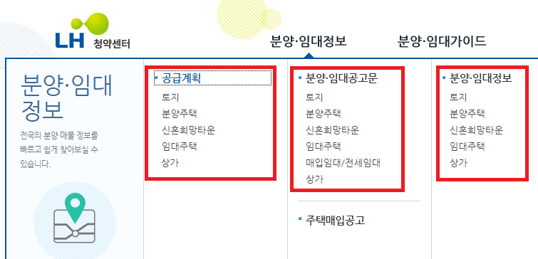 LH청약센터는 토지, 분양주택, 상가, 임대주택, 신혼 희망타운, 전세 임대에 대한 공급을 알 확인할 수 있다.