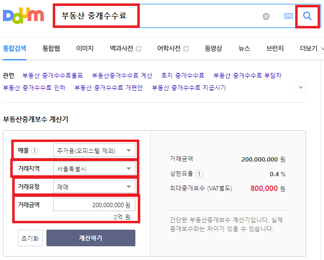 ㄱ) 다음 사이트에서 부동산 중개수수료 검색 후 클릭하면 부동산 중개보수 계산기가 나온다.