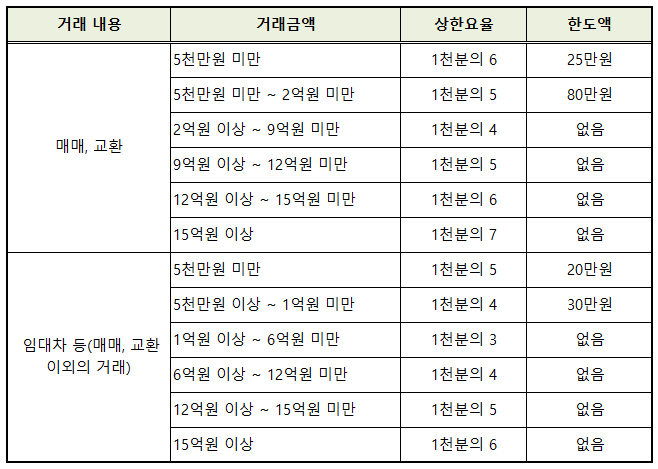 아래의 아파트 중개 수수료에서 알 수 있듯이 중개수수료율은 거래 금액과 내용에 따라서 달라진다.