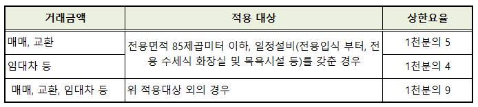 오피스텔은 전용면적 85제곱미터 이하의 경우 매매와 교환 상한 요율은 0.5%이고, 임대차는 0.04%이다.