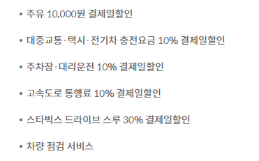 주유를 하면 카드사 별로 포인트 또는 할인 등 다양한 혜택을 적용받을 수 있으며, 정유사 멤버십 카드도 적립이 가능하다.