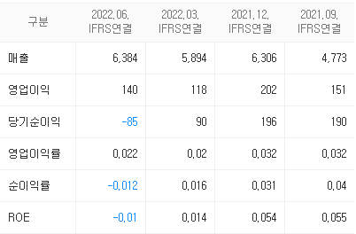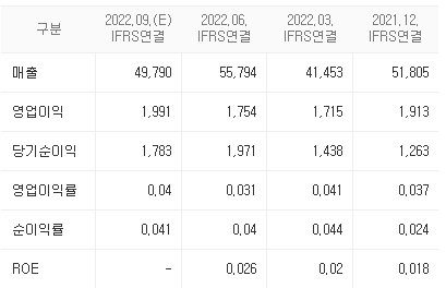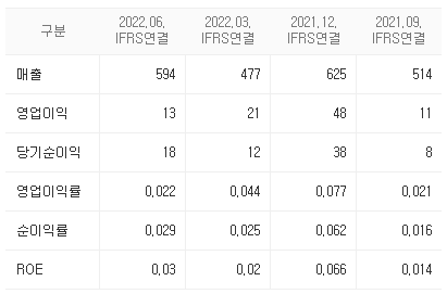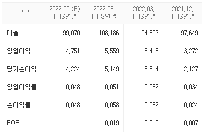 - 매출 비중은 21년 말 하반기 기준 건설부문 32%, 상사부문 50%, 패션부문 4.5%, 리조트 부문 1.5%, 급식/식자재 유통 6.7%, 바이오 부문 4.1%을 차지하고 있다.