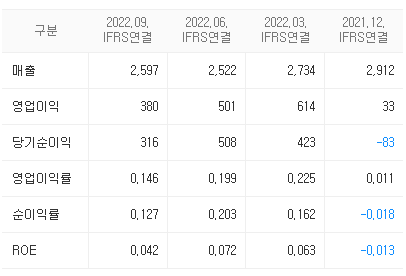 - 환율 상승 등의 외부적인 위험 요인 등으로 인해 매출액이 감소하고 금리 상승과 국제 곡물가 및 육계 시세 상승으로 인한 제조비용 상승 등으로 인해 영업이익과 당기순이익 이 감소하고 있다.