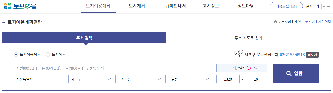 ㄱ) 토지 이음에 접속하여 주소 검색으로 토지이용계획 열람을 확인할 수 있다. (https://www.eum.go.kr/)
