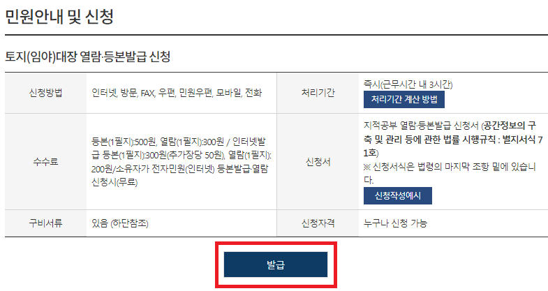 ㄷ) 신청내용을 작성하고 민원 신청하기를 클릭한 후에 신청한 토지대장을 열람하면 된다.