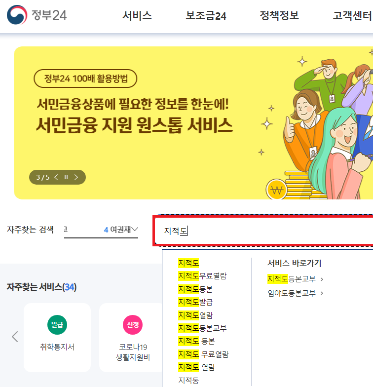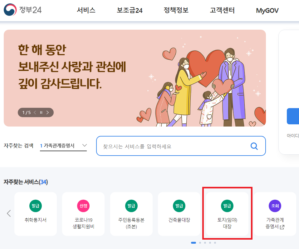 ㄱ) 정부 24에서 토지대장을 검색 또는 자주 찾는 서비스에서 클릭한다.