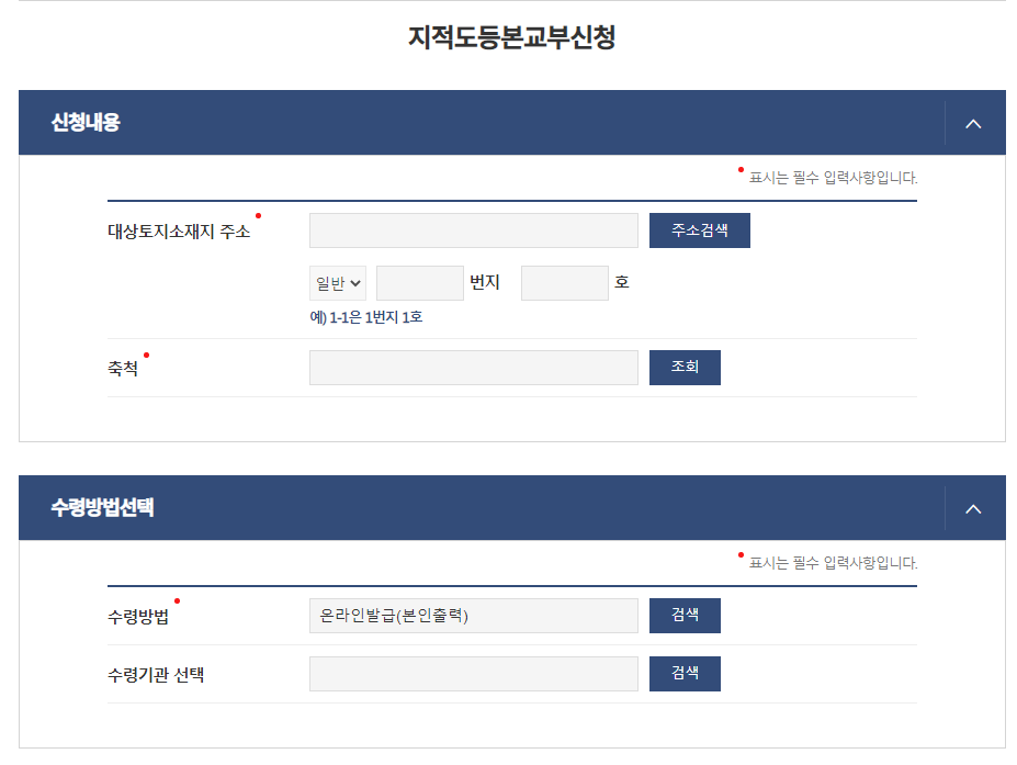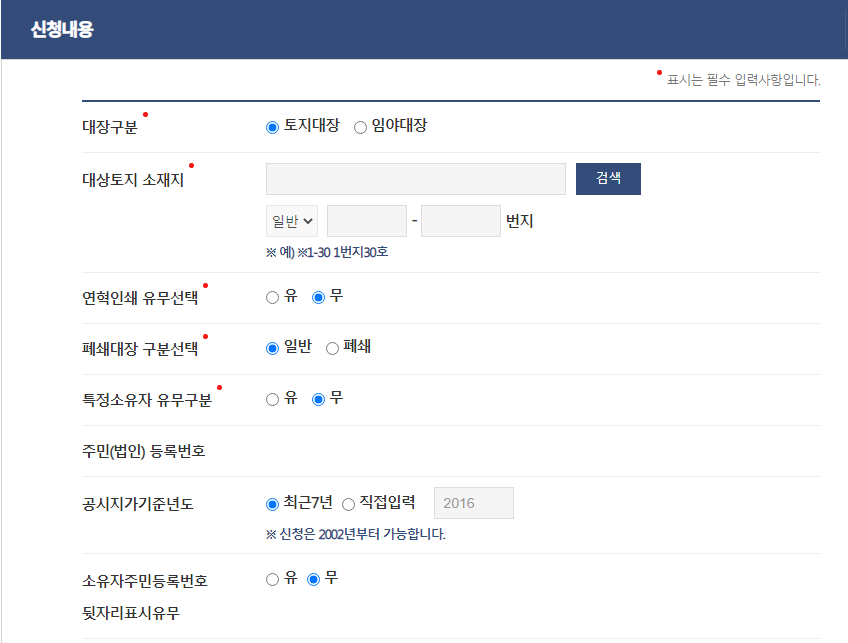 ㄴ) 지적도 등본교부 신청에서 정보를 입력 후 클릭한다.