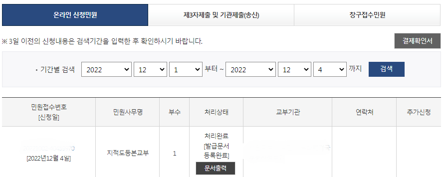 ㄷ) 서비스 신청내역에서 문서 출력을 클릭하여 문서를 열람한다.