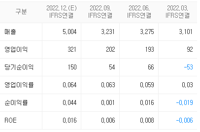- 동사의 신재생에너지 및 재활용 업무와 관련된 실적은 2022년 반기 기준으로 약 159억 원, 회사 전체 매출액의 약 10%를 차지하고 있다.