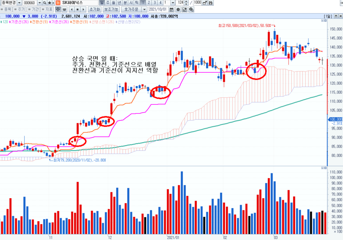ㄱ) 주가의 방향이 상승 국면 일 때: 주가, 전환선, 기준선 순으로 배열된다.