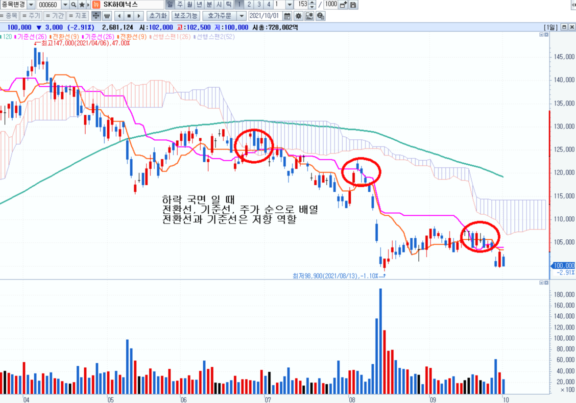 매도 포인트: 기준선이 전환선을 하향 돌파하였을 때,