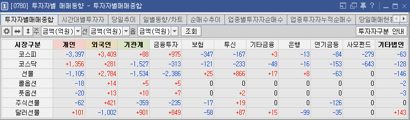외국인은 코스피, 코스닥, 선물을 매수했으나 지수의 상승은 미비했다. 오늘도 외국인은 삼성전자에 약 천억 원을 매수했다.