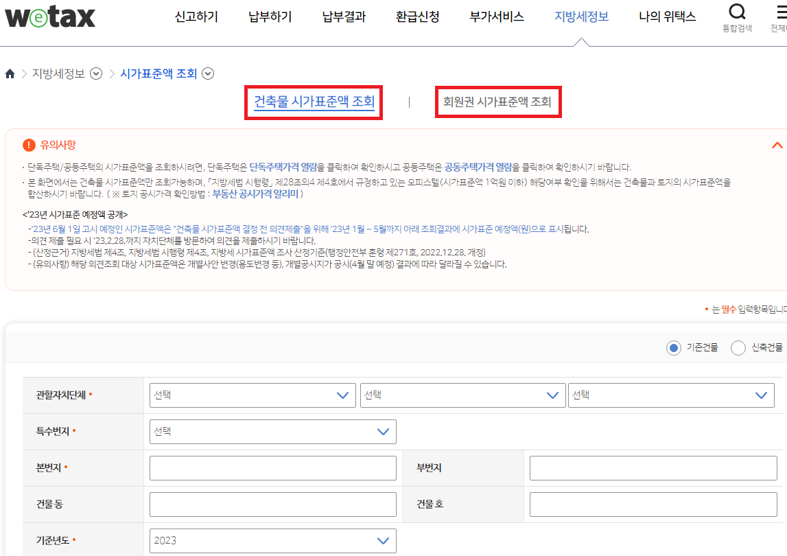 위텍스(https://www.wetax.go.kr/main/?cmd=LPTINB1R0) → 지방세 정보 → 시가표준액 조회에서 건축물 시가표준액을 조회할 수 있다.